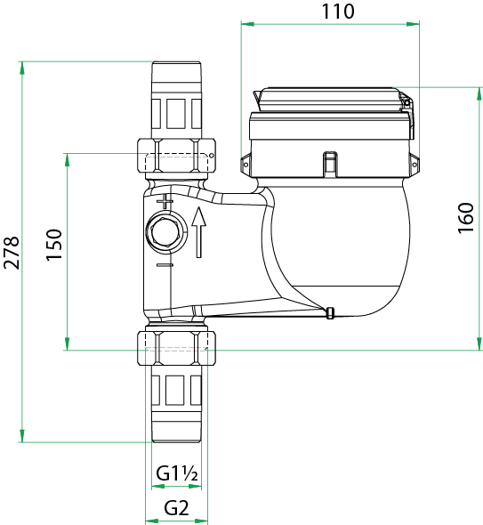 Mehrstrahl Hauswasserzähler in Impulsausführung - Nassläufer für Kaltwasser - 16,0 m³/h - G1½ AG / G2 Überwurf - Einbaulage Steigrohr
