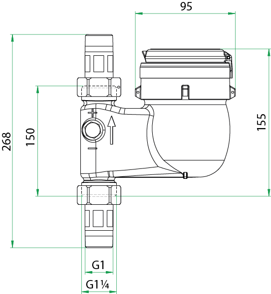 Mehrstrahl Hauswasserzähler in Impulsausführung - Nassläufer für Kaltwasser - 10,0 m³/h - G1 AG / G1¼ Überwurf - Einbaulage Steigrohr