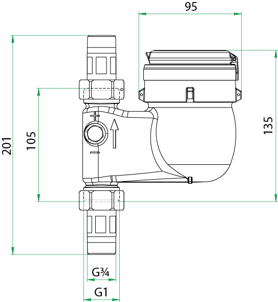 Mehrstrahl-Hauswasserzähler in Impulsausführung - Nassläufer für Kaltwasser - 4,0 m³/h - G¾ AG / G1 Überwurf - Einbaulage Steigrohr