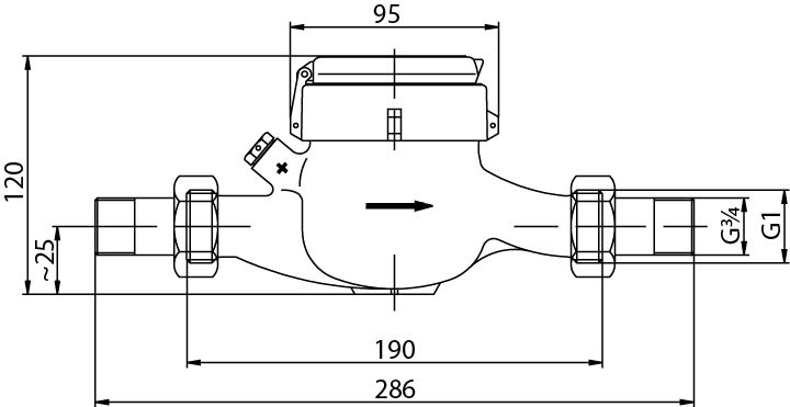 4,0 m³/h - G¾ AG / G1 Überwurf für Kaltwasser - Baulänge 190 mm