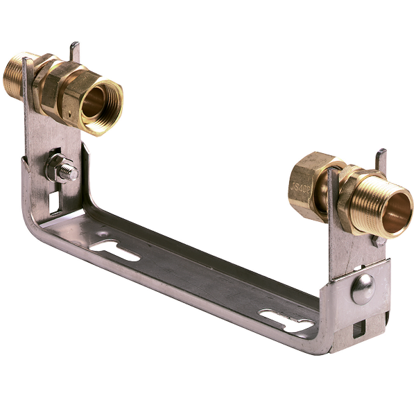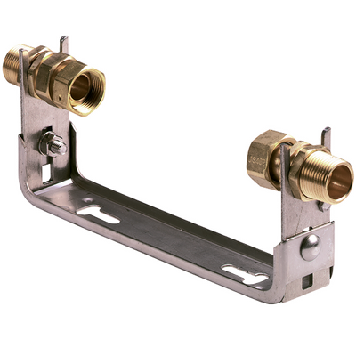 Die Garnitur besteht aus einem Befestigungsbügel sowie zwei offenen, starren Tragarmen. Die Falz ist nach innen gerichtet und verfügt über beidseitige Kreuzschlitze zur optimalen Justierung. Die Längenausgleichsverschraubung aus Messing ist mit einer O-Ring-Dichtung versehen. Die Wasserzähler-Anschlussverschraubung entspricht der DIN ISO 228.