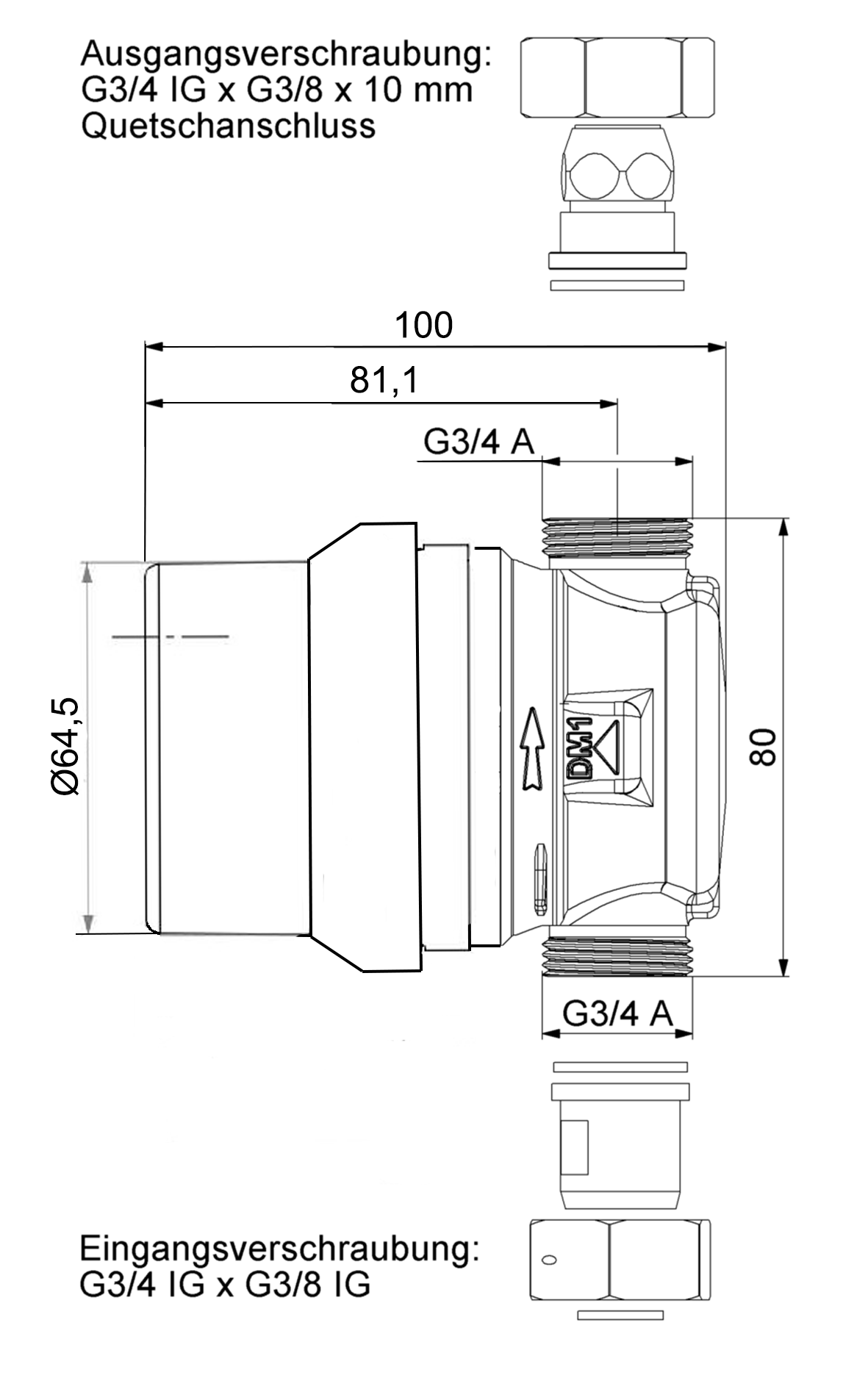 Anschlussschnittstelle DM1: Eckventilzähler smart i OMS G¾ mit integriertem Funk für Kaltwasser und Warmwasser