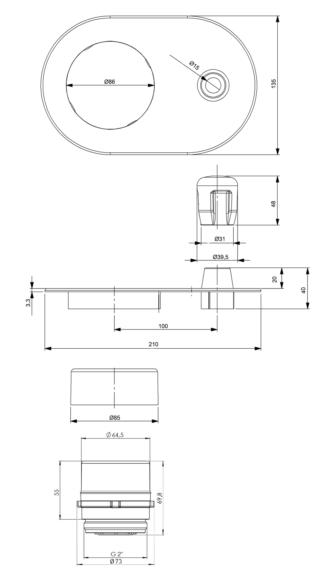 • einteiliger verchromter Wandrosette mit Zylinder