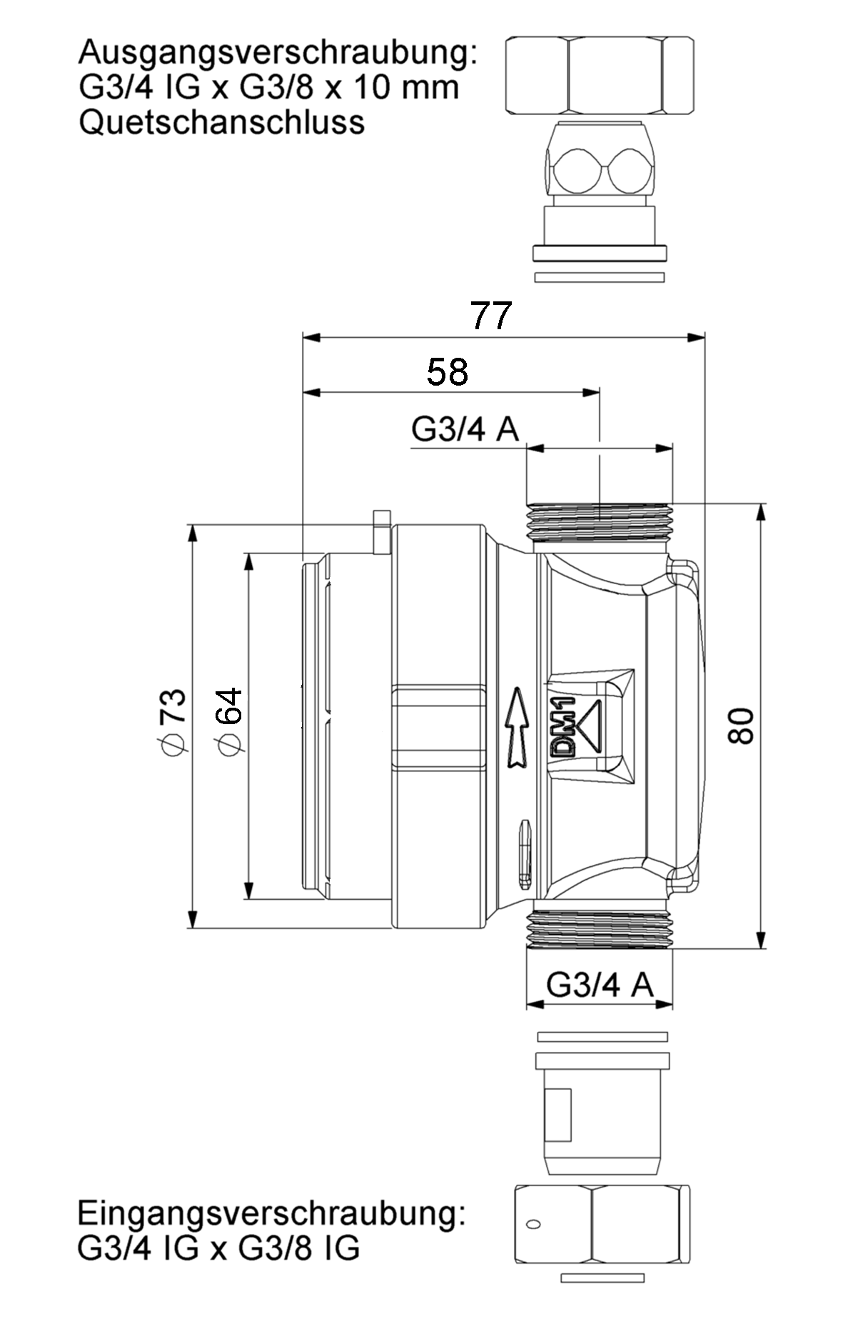 • mit Eingangsverschraubung G⅜ IG auf G¾ IG und Ausgangsverschraubung für 10 mm Kupferrohr, verchromt
