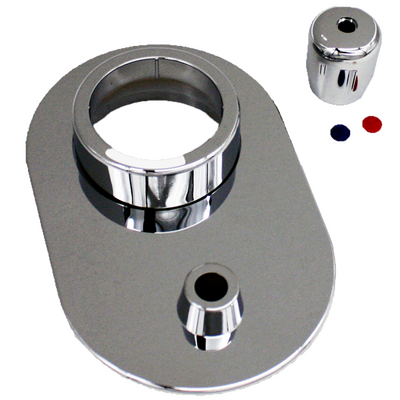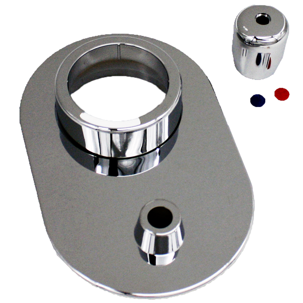 Die DELTAMESS-Chromgarnitur für den Koax-Miniblock in ovaler Ausführung besteht aus einer passgenauen Wandabdeckrosette, einem Zylinder und einem Ventilgriff.